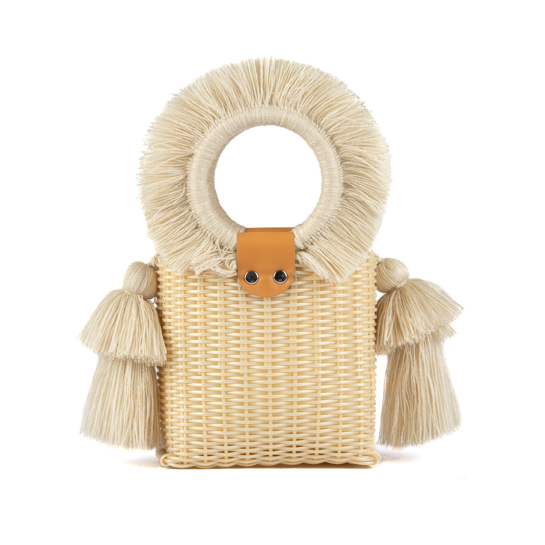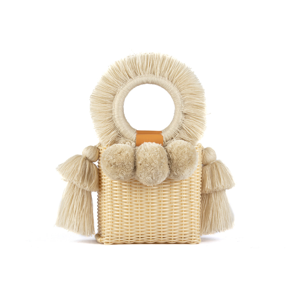 We’re in love with the aura of our best-seller Almita. It speaks of protection, wisdom and inner knowledge. Add this fashionable mini bag in recycled plastic thread with fringes in raw wool and pompoms to your look.